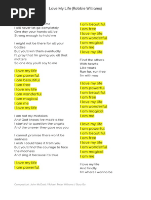 I love my life I am powerful I am beautiful I am free I love my life I am wonderful I am magical I am me I love my life I am not my mistakes And God knows, I've made a few I started to question theFalla salire di classifica lasciando un commento o cliccando su Mi piace e su 1 qui sotto!About Love My Life "Love My Life" is a song by British singersongwriter Robbie Williams, released as the second single from his eleventh studio album Heavy Entertainment Show (16) The single was released in the United Kingdom on October 16 The song was written by Williams, Johnny McDaid, and Gary Go